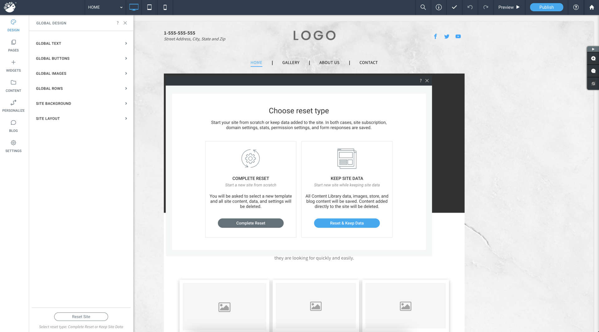 In the slide out tray, right down at the bottom is the 'Reset site' button.